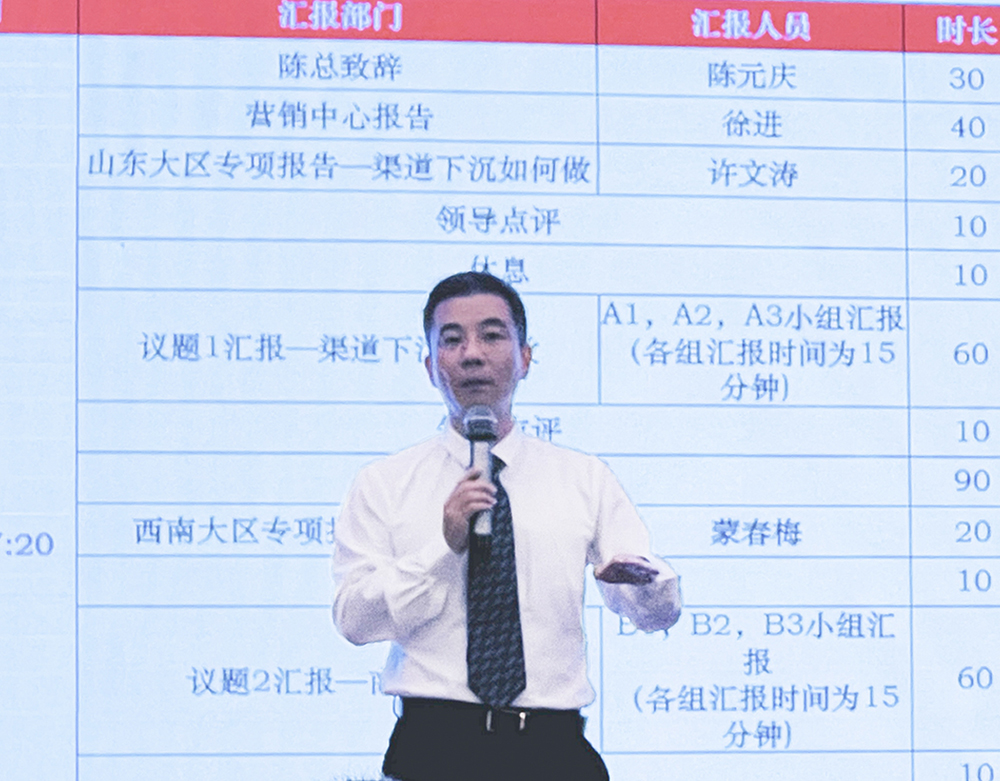 首先是關(guān)于渠道下沉工作的重點部署!執(zhí)行副總陳元慶先生指出,渠道下沉不是每個地區(qū)都必須要去做,選對地區(qū)選對市場很關(guān)鍵。通過對推進工作的持續(xù)跟進以及細心周到的服務(wù),將有助于找準機會點,加快推進商用渠道拓展。