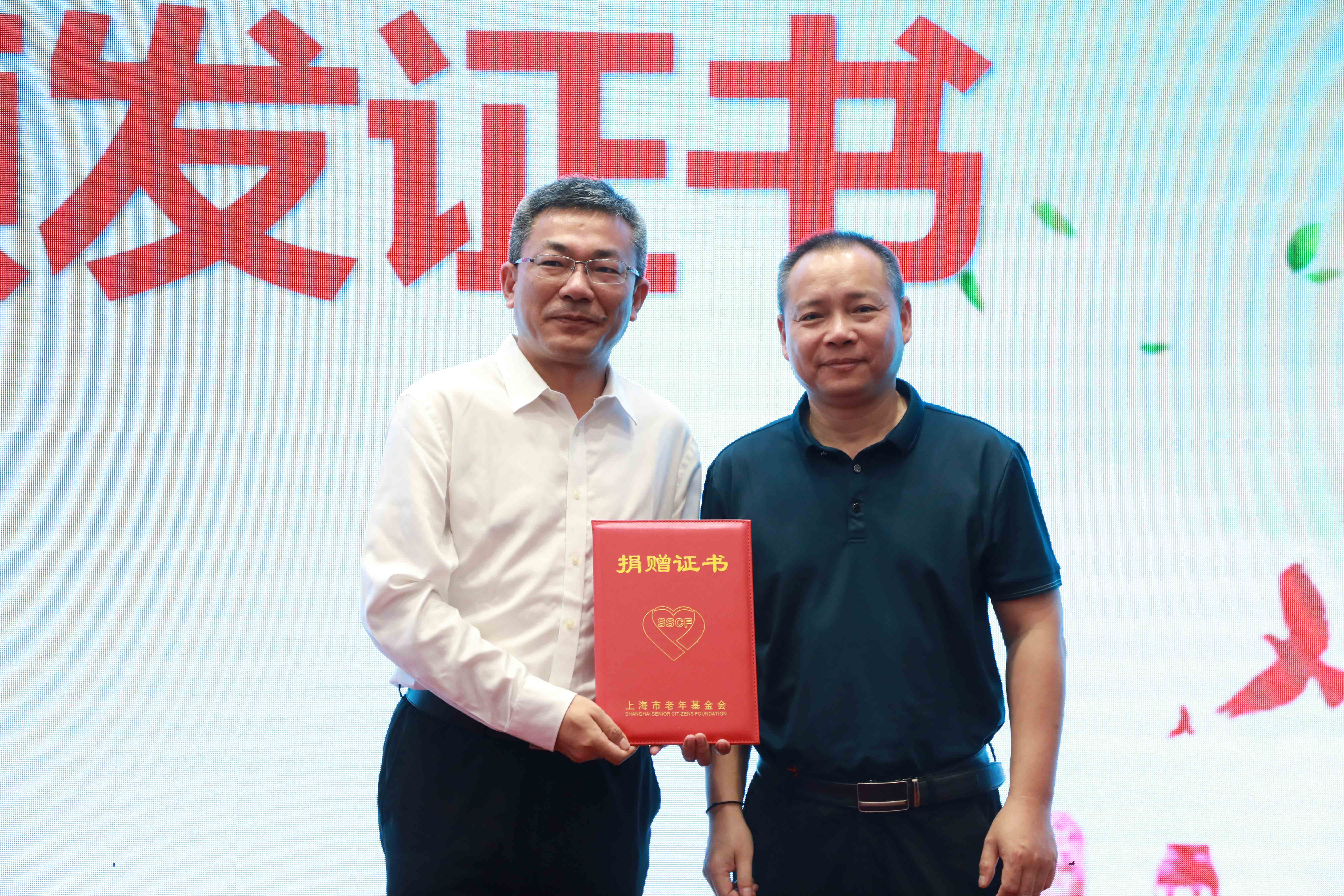 靜安區(qū)民政局沈連心副局長(右)頒發(fā)捐贈證書