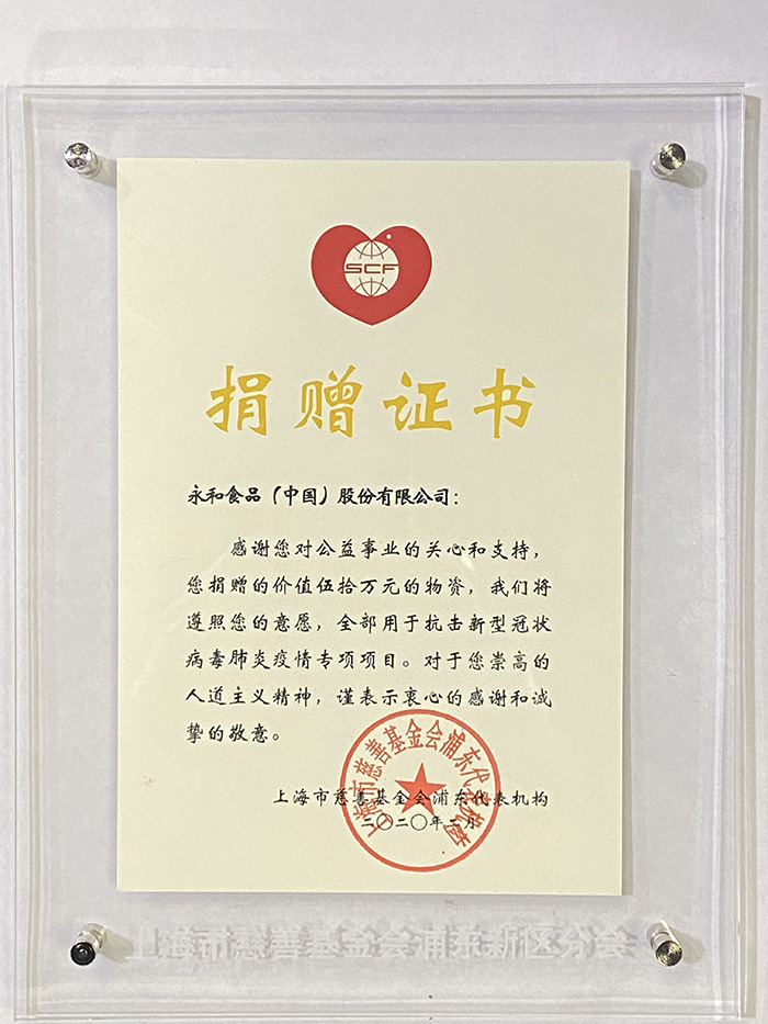 捐贈儀式在浦東新區(qū)政府行政辦公中心舉辦,浦東新區(qū)區(qū)委常委、統(tǒng)戰(zhàn)部部長金梅,浦東新區(qū)副區(qū)長徐惠麗等領(lǐng)導出席儀式。永和食品(中國)股份有限公司董事長林建雄特派瞿江琴副總經(jīng)理作為企業(yè)代表組織捐贈并接受了上海市慈善基金會頒發(fā)的捐贈證書和感謝信。