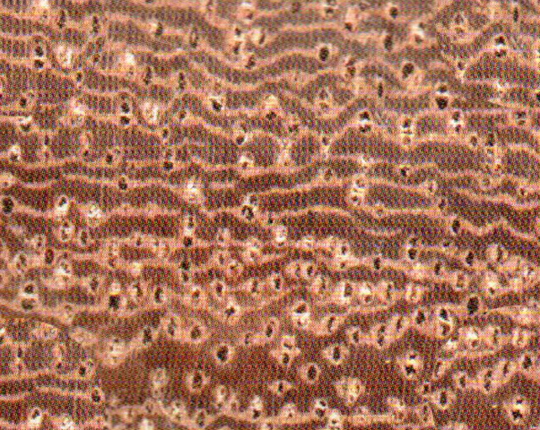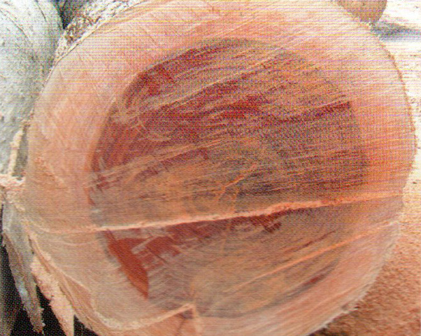 心邊材區(qū)時段明顯,心材暗紅褐色,具黑色同心圓狀細(xì)條紋,邊材粉紅褐色或淺黃白色、較寬,5-8cm。生長輪明顯。